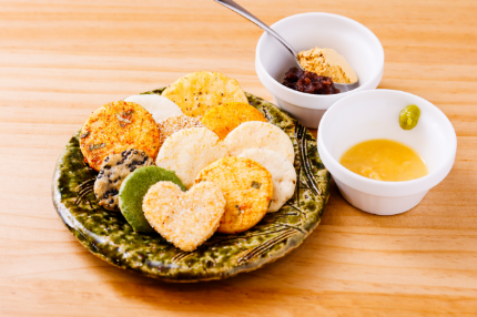 12種類のおせんべい×8種類のディップソース自分好みに組み合わせてお楽しみください。